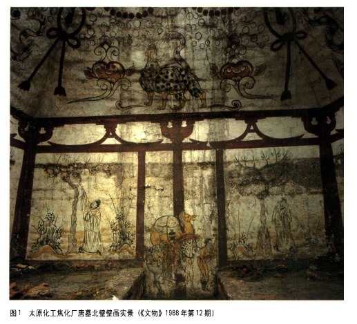 1987年太原化工焦化厂内清理了一座唐代弧形壁单室墓(山西省考古研究所《太原市南郊唐代壁画墓清理简报》,《文物》1988年第12期),墓室北部的东、西两侧各有一个纵向的棺床,覆头形墓顶正中有一破洞,报告较为详细地描述了壁画:“用红、黄、绿三色画出挽结的花幔,其间以弧形联珠纹相接”;“四壁用红色粗线绘出房屋的立柱、斗拱、阑额枯,补间铺作绘人字拱。下边分成几个界格……每格内绘壁画,分别有《侍卫图》、《侍女图》、《驼马人物图》、《树下老人图》等”(图1)。