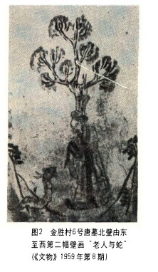 它的原型应该是以表现孝子、贤人为主的这类'忠孝图',而不是墓主人像或者道教人物故事”的看法是正确的(赵超《“树下老人”与唐代的屏风式墓中壁画》,《文物》2003年第2期)。同时他还认为“一些画面是可以与历代著名的孝子忠臣等古代故事联系起来得到确认的”,并且指认了金胜村6号墓的6幅《树下老人图》中,用斧(柄)挑柴者是曾子;双手举节者是苏武;比照太原化工焦化厂唐墓中面向坟丘恸哭者是王裒;树下有竹笋的则是孟宗……对6号墓、337号墓壁画中都有的一幅《老人与蛇图》(图2、3),赵超先生认为“或许是在表现春秋时孙叔敖打死两头蛇的故事……也有可能确实是表现隋侯珠的故事”,或是周代“伯奇行孝”(赵超《关于伯奇的古代孝子图画》,《考古与文物》2004年第3期)。金胜村6号墓简报对《老人与蛇图》是这样描述的,老人“双手托巾,俯身下视一兽头、蛇身、口内衔物(珠)、项束红巾的动物”。金胜村337号墓的简报则描述老人“面前一蛇,口中衔珠,昂首腾起,献珠于老翁”。探寻图像本来的创作意义,得益于老人接受和长蛇给予,凝缩了人物关系的物像(红色圆珠)征兆。笔者以为还是郑岩先生解释为“隋侯珠”故事来得更恰当(郑岩《武氏祠隋侯之珠画像》,《文物天地》1991年第2期)。至于金胜村6号墓剩余的一幅(东壁由南至北的第三幅)画面:树下老人举一物于嘴边,似做尝试样。相似于337号墓西壁北侧的画面“一戴冠穿长袍的老翁站立树下,左手抱胸前,右手拿一小枝树叶伸于脸前”。亦相似于4号墓西壁中间的画面,树下老翁“右手捏一朵(红花?)作嗅状”的人物形象,笔者倾向于解释为“蔡顺为母采楼”的孝子故事。